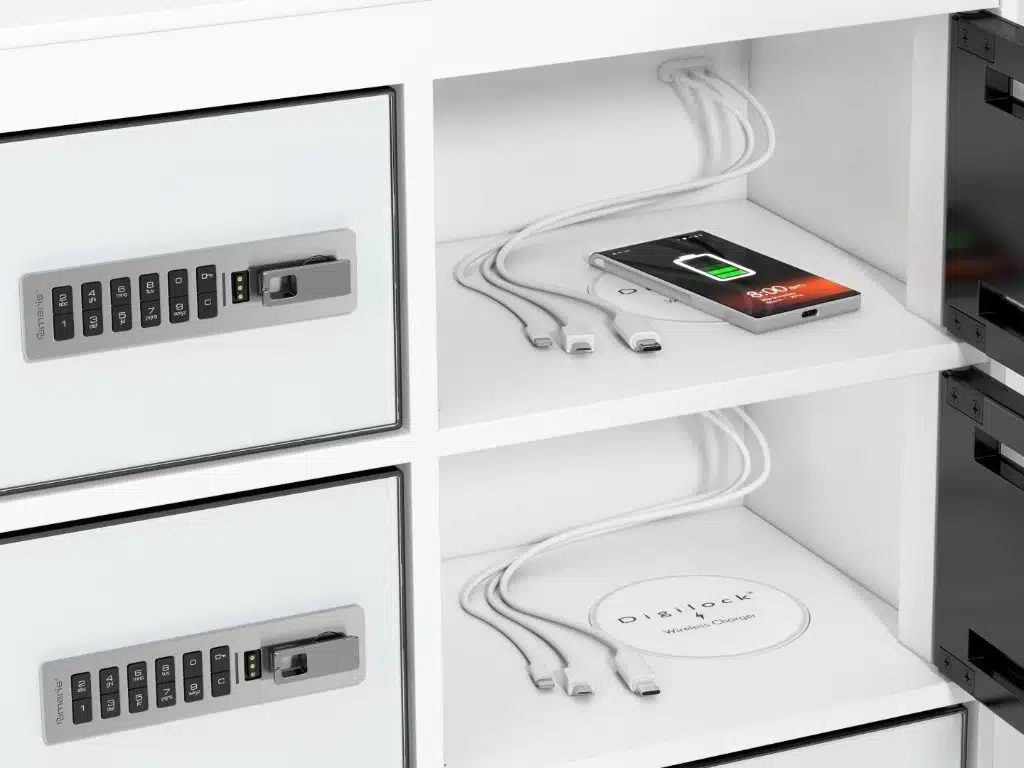Deze compacte locker met 10 of 20 compartimenten is gemaakt van staal en voorzien van breukbestendige deuren van gehard veiligheidsglas. Elk vak heeft een eigen pincode-slot, zodat sporters hun telefoon of earbuds beschermd kunnen opladen, maar ook sieraden, sleutels en passen veilig kunnen opbergen.