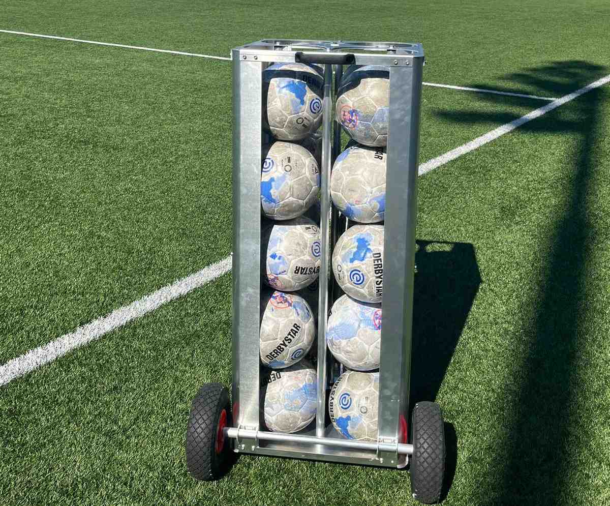 Degelijke, verrijdbare ballenkar voor 20 ballen. Inclusief vast wielstel en rond gezette hoeken. De ballenkar is volledig van aluminium en kan d.m.v. een hangslot afgesloten worden.